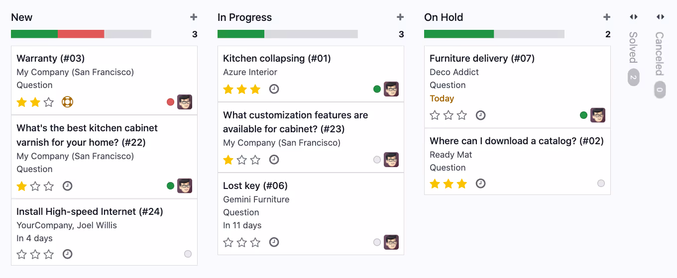 Customize your workflow with a kanban view for clear organization, real-time team workload tracking, and automated SLA-based ticket management.