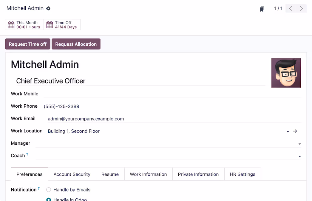 From allocation to request to approval, make every step of the time off process easy and transparent with Odoo's Time Off application.