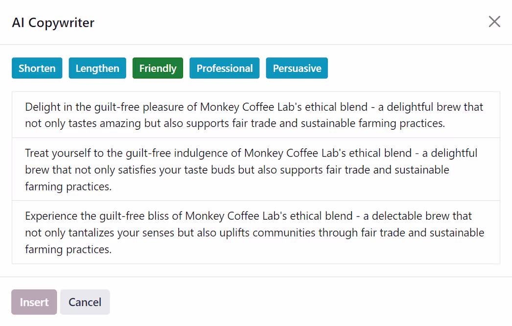 Boost your copy-writing with ChatGPT. Ask Odoo to generate your website’s content from a simple prompt, or improve your current text by applying the right tone in one click.